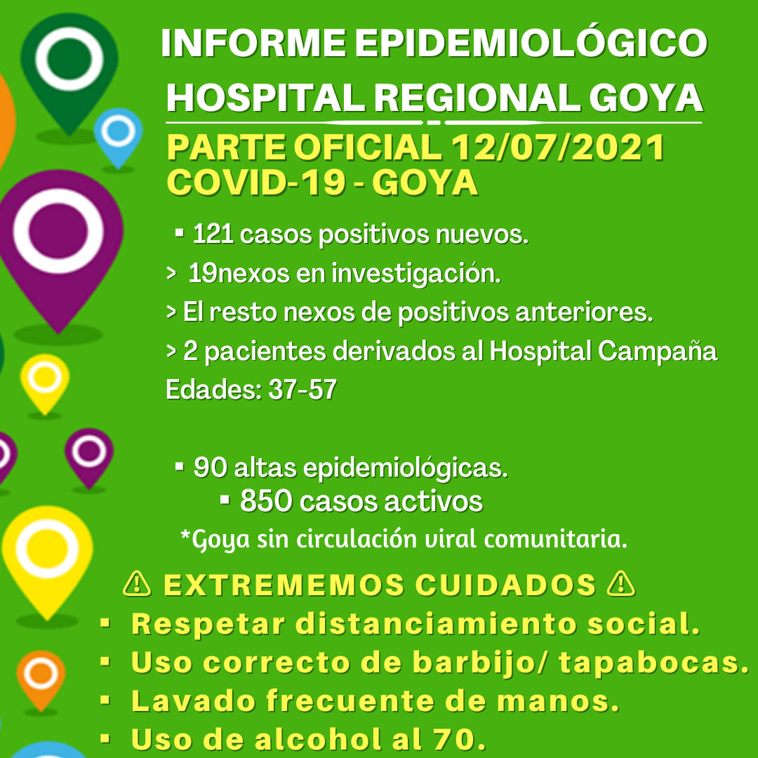 Noticias121 nuevos casos de covid en Goya 12 julio, 2021 La segunda ciudad de la provincia arrancó la semana con un importante alza de contagios. Son 121 los nuevos casos informados este lunes 12 de julio de los cuales 19 nexos están en investigación. El total de casos activos en Goya es de 850.