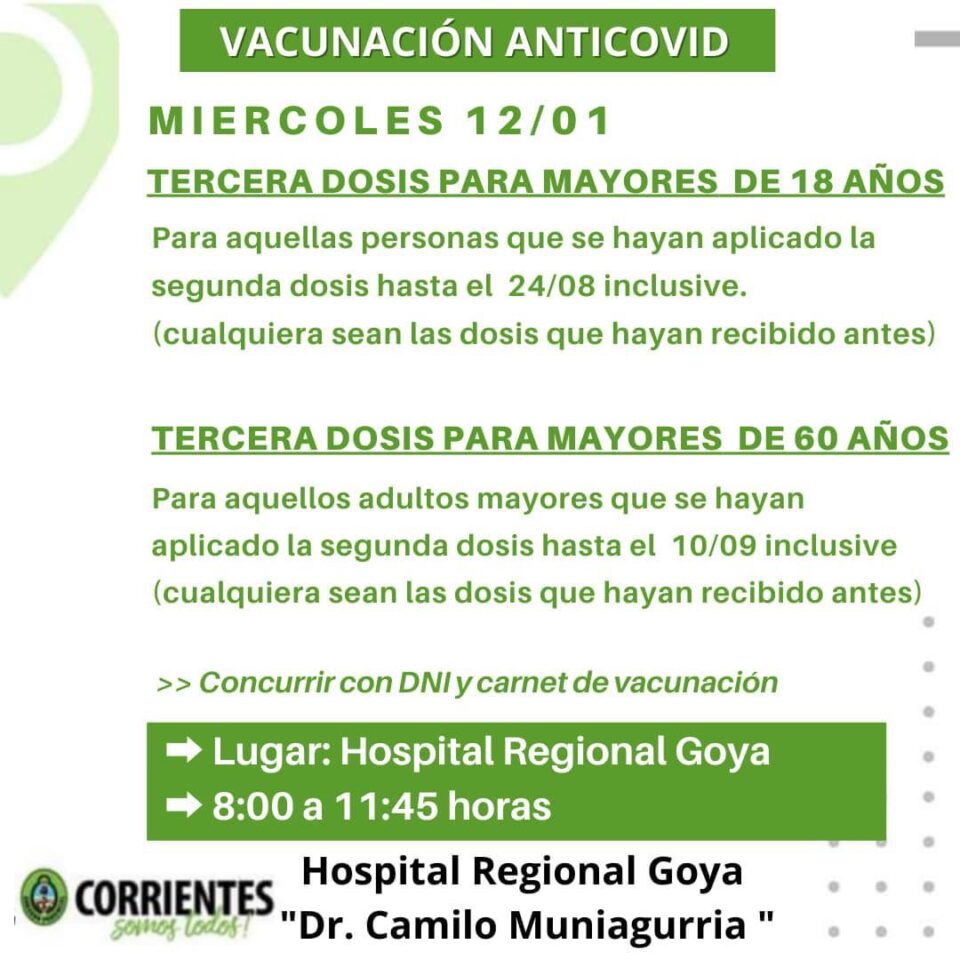 Desde el Hospital Regional de Goya »Dr. Camilo Muniagurria» informaron que este miércoles 12 continúa la aplicación de la tercera dosis de vacuna para combatir al Covid19.