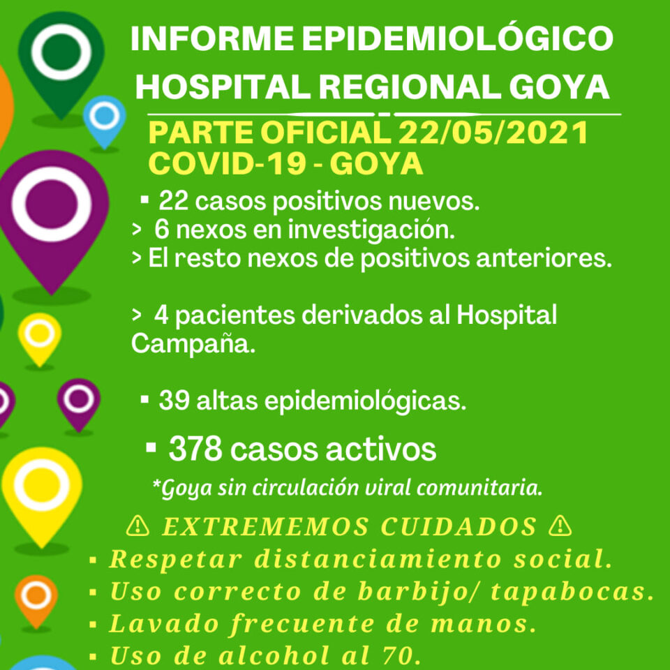 Tras una nueva e intensa jornada de hisopados el Hospital de la ciudad de Goya, “Camilo Muniagurria” informó que durante este sábado se reportaron 22 nuevos casos positivos. Mientras que 4 pacientes fueron derivados al Hospital de Campaña de Corrientes, y los casos activos ya son 378.