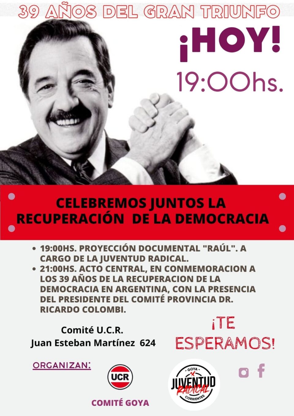 Hoy lunes a las 19:00 horas, en su sede partidaria ubicada en Juan E. Martinez en la ciudad de Goya, la UCR realizará un acto de celebración con la presencia del Presidente del Comité Provincial Ricardo Colombí. Esta previsto la proyección de un documental sobre Alfonsín, dando inicio al acto central. Se invita a los vecinos a participar para la conmemoración de un hecho histórico y de significativa importancia para el país.