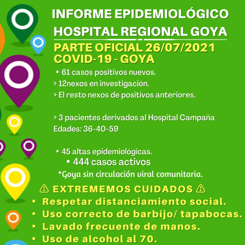 Noticias444 casos activos: reportan 61 nuevos contagios de coronavirus en Goya 26 julio, 2021 Así lo informó el Hospital Regional este lunes 26 de julio. Además se trasladaron a 3 pacientes al campaña y se otorgaron 45 altas epidemiológicas. Goya continua en fase 2.