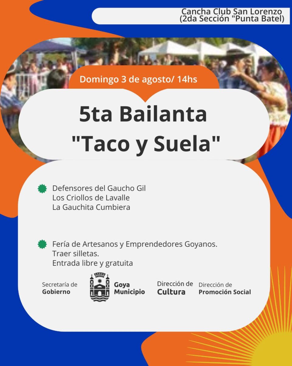 Con organización y auspicio de la Municipalidad de Goya este domingo 03 de Agosto desde las 14 horas, el paraje Punta Batel será epicentro de un nuevo capítulo del Taco y Suela, el programa itinerante cultural que inicia su recorrido por la zona rural. Este Domingo, la cita es en la cancha de San Lorenzo del mencionado Paraje Rural. La convocatoria para el domingo se extiende a los pobladores de parajes vecinos como: