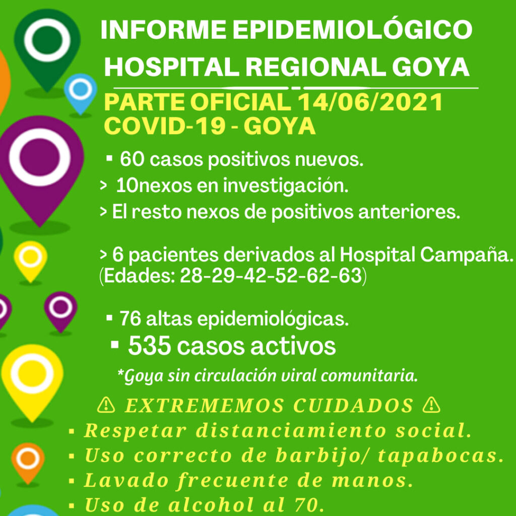Noticias60 nuevos contagios y 6 pacientes derivados al Campaña 14 junio, 2021 Comienza la semana en Goya con un importante alza en los contagios así también en los altas otorgadas. Son 535 los casos activos en nuestra ciudad. Se solicita extremar cuidados y tener en cuenta los cuidados básicos para evitar el covid-19.