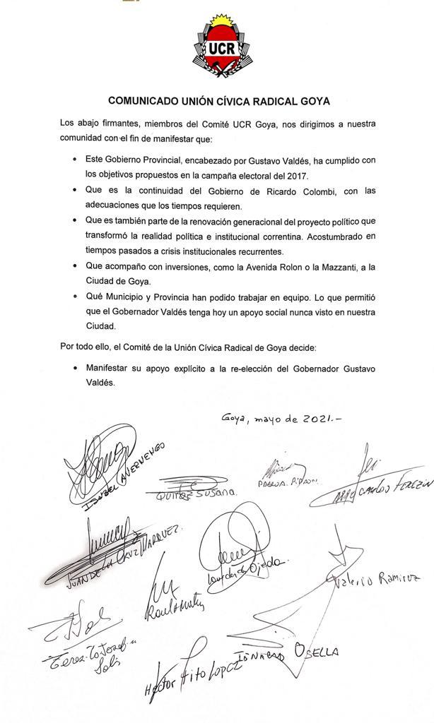 Los abajo firmantes, miembros del Comité UCR Goya, nos dirigimos a nuestra comunidad con el fin de manifestar que: