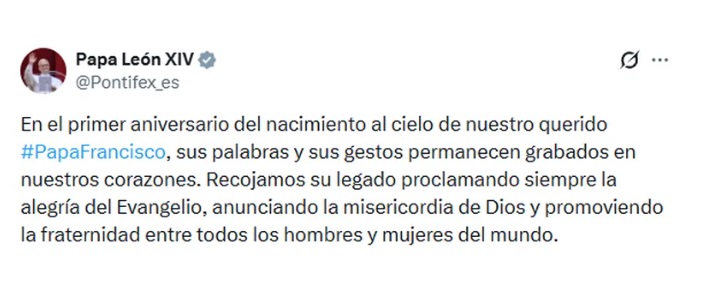 “En el primer aniversario del nacimiento al cielo de nuestro querido Papa Francisco, sus palabras y sus gestos permanecen grabados en nuestros corazones. Recojamos su legado proclamando siempre la alegría del Evangelio, anunciando la misericordia de Dios y promoviendo la fraternidad entre todos los hombres y mujeres del mundo”, expresó León XIV.