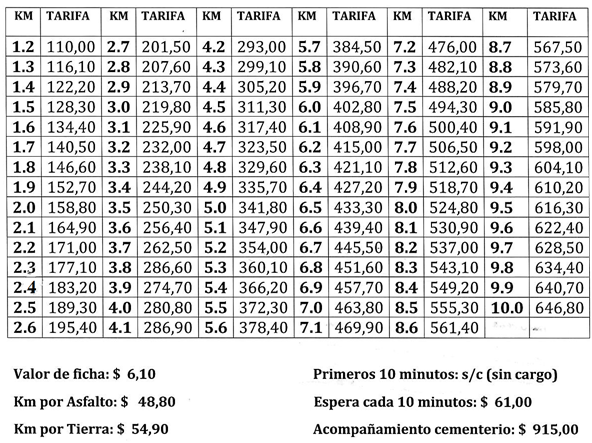 CUADRO TARIFARIO DEL SERVICIO DE REMISES Y TAXIS