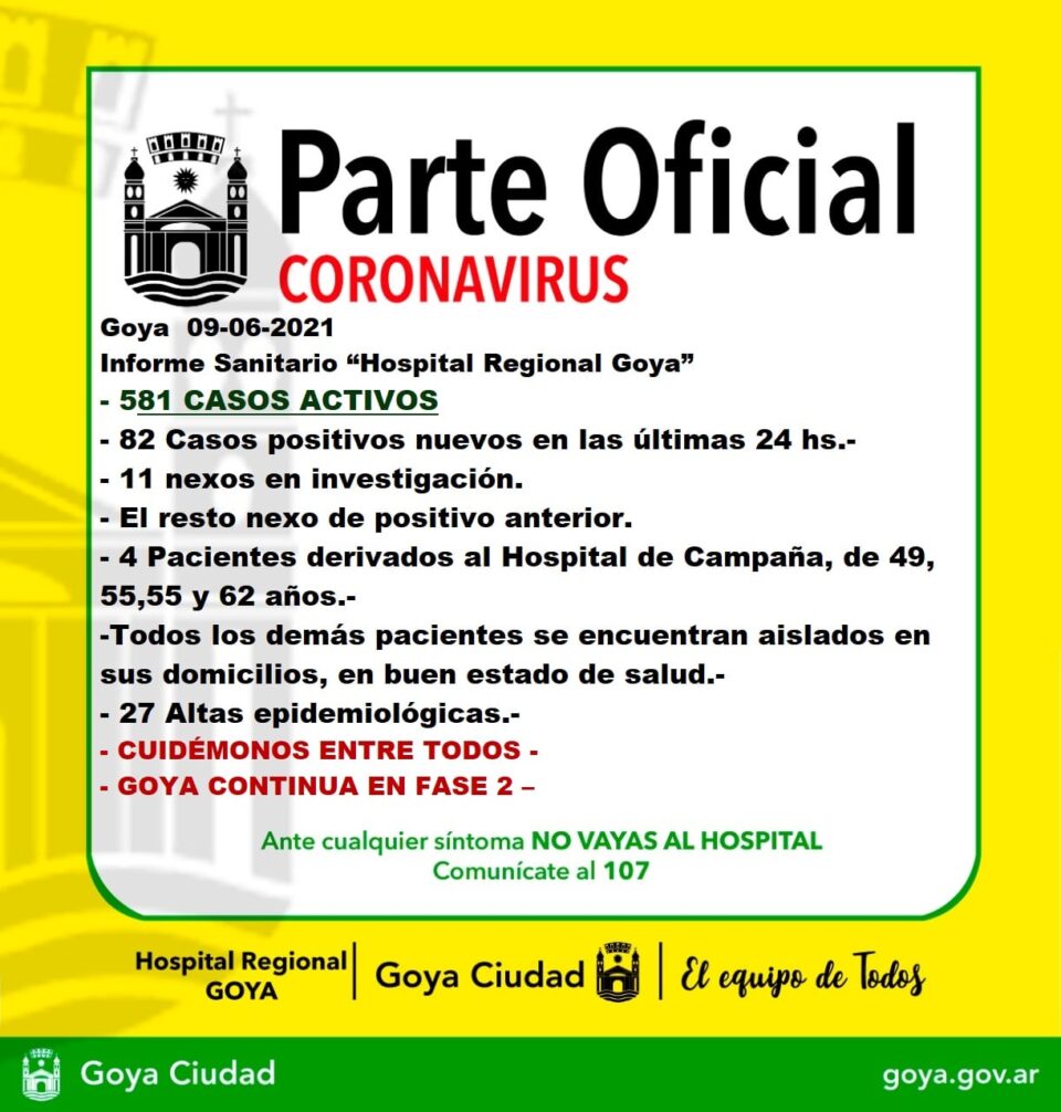 El Informe Sanitario del “Hospital Regional Goya” correspondiente al día de ayer 09-06, evidencio un alto crecimiento de contagios y casos activos que se registran en nuestra ciudad.