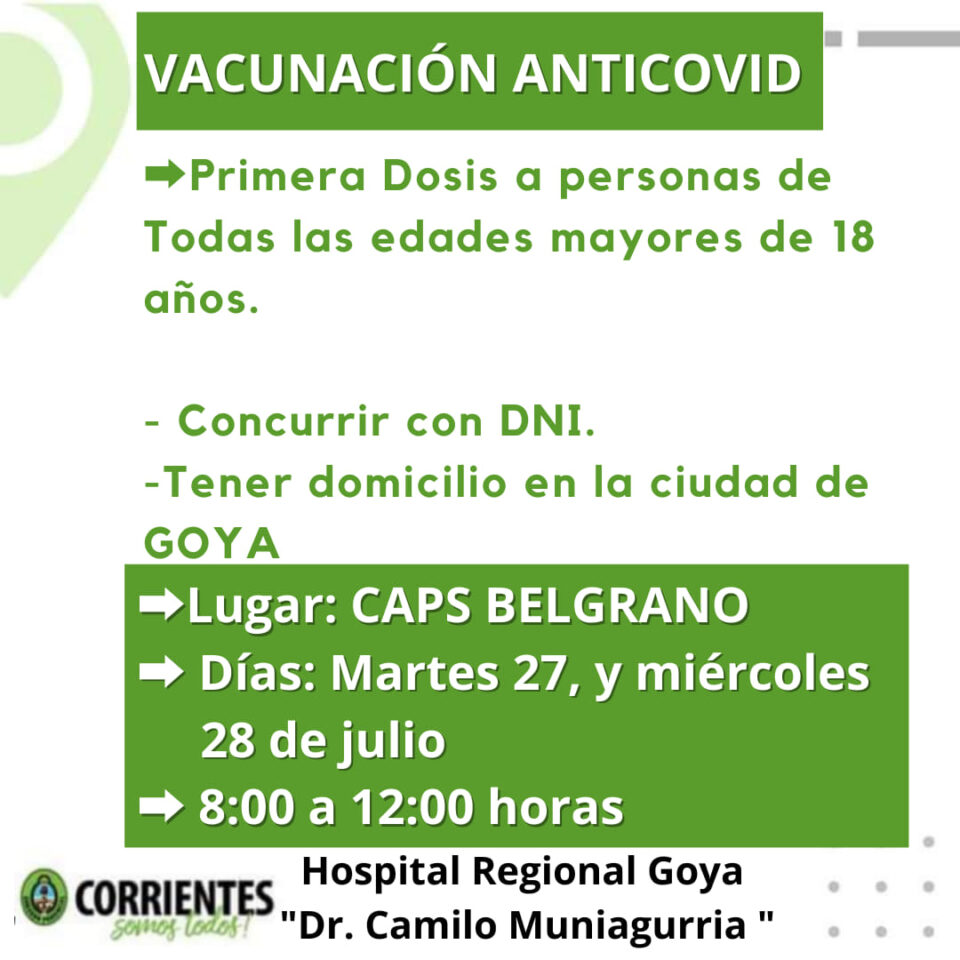 Desde el equipo de vacunación anti-covid del Hospital Regional de Goya, anunciaron que los días martes 27 y miércoles 28 del corriente mes se aplicará la primera dosis de la vacuna anti covid-19 para mayores de 18 años con domicilio en nuestra ciudad.