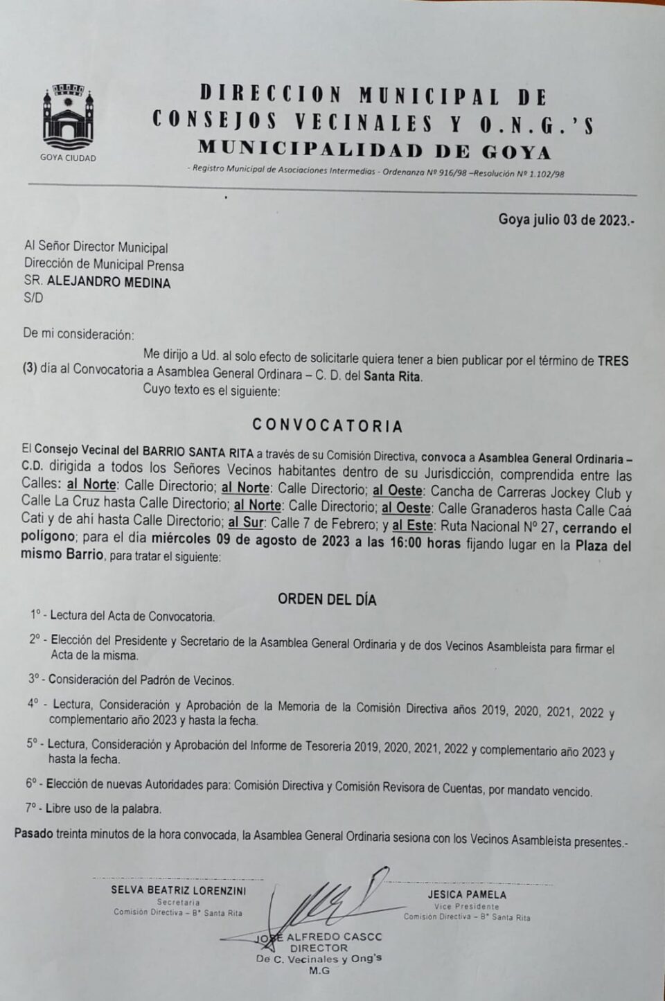 EI Consejo Vecinal del BARRIO SANTA RITA a través de su Comisión Directiva, convoca a Asamblea General Ordinaria – C.D. dirigida a todos los Señores Vecinos habitantes dentro de su Jurisdicción, comprendida entre las Calles: al Norte: Calle Directorio; al Norte: Calle Directorio; al Oeste: Cancha de Carreras Jockey Club y Calle La Cruz hasta Calle Directorio; al Norte: Calle Directorio; al Oeste: Calle Granaderos hasta Calle Caá Cati y de ahí hasta Calle Directorio; al Sur: Calle 7 de Febrero; y al Este: Ruta Nacional N° 27, cerrando el polígono, para el día miércoles 09 de agosto de 2023 a las 16:00 horas fijando lugar en la Plaza del mismo Barrio, para tratar el siguiente: