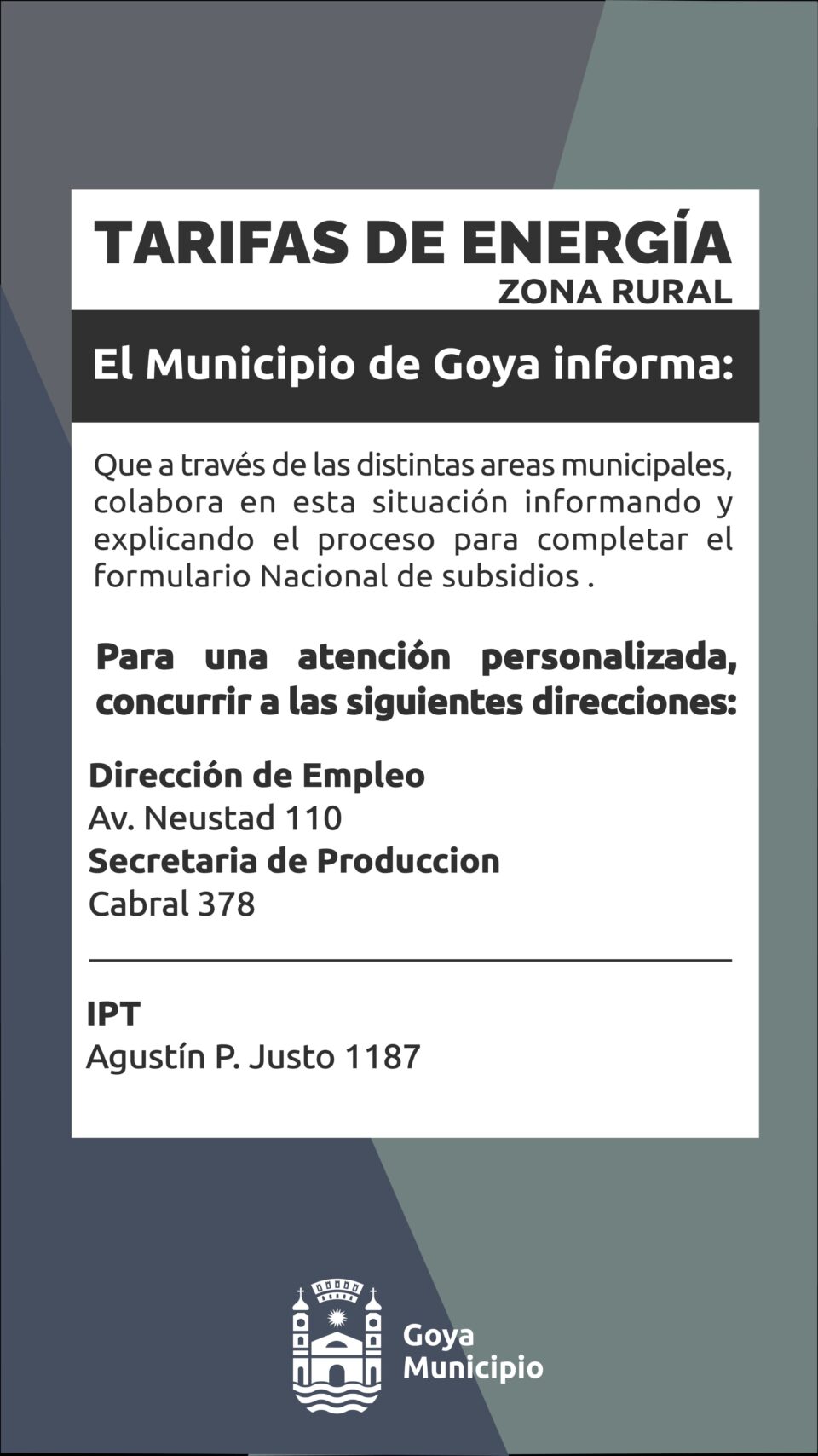 A través de áreas municipales colabora en esta situación, informando y asesorando en el proceso para completar el formulario Nacional de subsidios a la energía eléctrica.