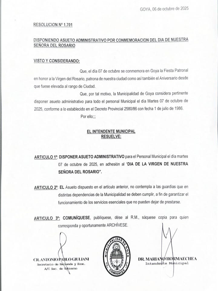 VISTO Y CONSIDERANDO: Que, el día 07 de Octubre se conmemora en Goya la Fiesta Patronal en honor a la Virgen del Rosario, patrona de nuestra ciudad como así también el Aniversario desde que fuese elevada al rango de Ciudad. Que, por tal motivo, la Municipalidad de Goya considera pertinente disponer asueto administrativo para todo el personal Municipal el día Martes 07 de octubre de 2025, conforme a lo establecido en el Decreto Provincial 2580/86 con fecha 1 de julio de 1986.