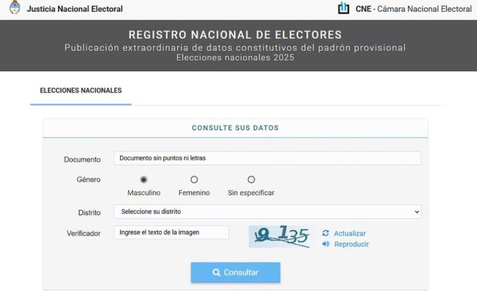 La Cámara Nacional Electoral enfatizó la importancia de que los ciudadanos realicen la consulta, con el fin de verificar si sus datos personales son los correctos. Estará habilitado hasta el 30 de Noviembre inclusive.