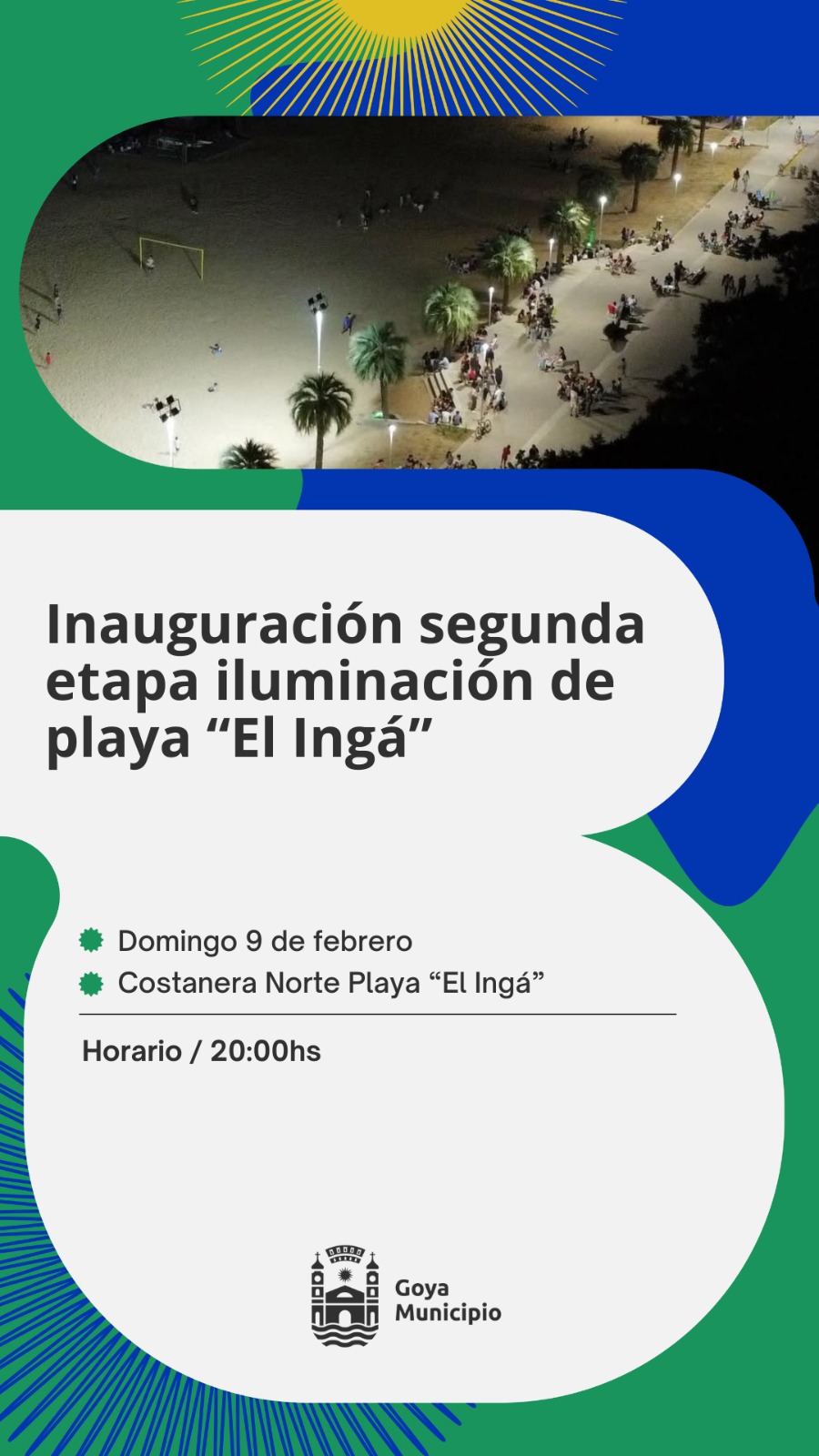 Este Domingo 9 de Febrero, a las 20 horas, la Costanera Norte de Goya será el escenario de un importante avance en infraestructura turística y recreativa. La Municipalidad invita a vecinos, turistas y medios de comunicación a la inauguración de la segunda etapa de iluminación de Playa “El Inga”, un proyecto que busca potenciar este espacio como un punto clave de encuentro y esparcimiento para la comunidad.