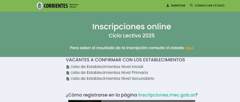 La página de inscripciones.mec.gob.ar se encontrará habilitada hasta el 25 de noviembre para los alumnos que deban cursar el nivel primario. En el portal se encontrarán con un listado donde podrán observar cuantas vacantes hay disponibles en las escuelas que deseen asistir.