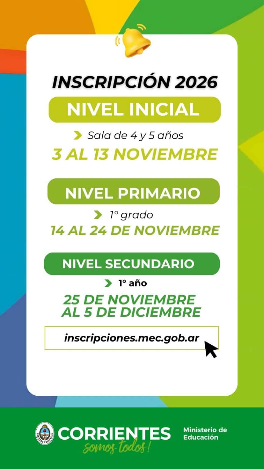 El cronograma del Ministerio de Educación de Corrientes establece que las inscripciones para el Nivel Inicial comenzarán el 3 de noviembre y se extenderán hasta el 13, mientras que para el Nivel Primario el período irá del 14 al 24 del mismo mes. Finalmente, el Nivel Secundario abrirá su registro desde el 25 de noviembre hasta el 5 de diciembre.