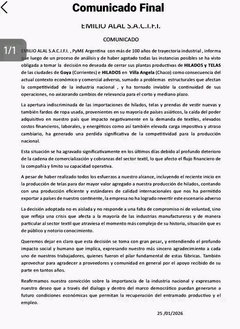 La empresa Emilio Alal S.A.C.I.F.I. anunció el cierre definitivo de sus plantas productivas de hilados y telas en la ciudad de Goya, Corrientes, y de hilados en Villa Ángela, Chaco. La decisión fue comunicada oficialmente por la firma, una PyME argentina con más de 100 años de trayectoria industrial.
