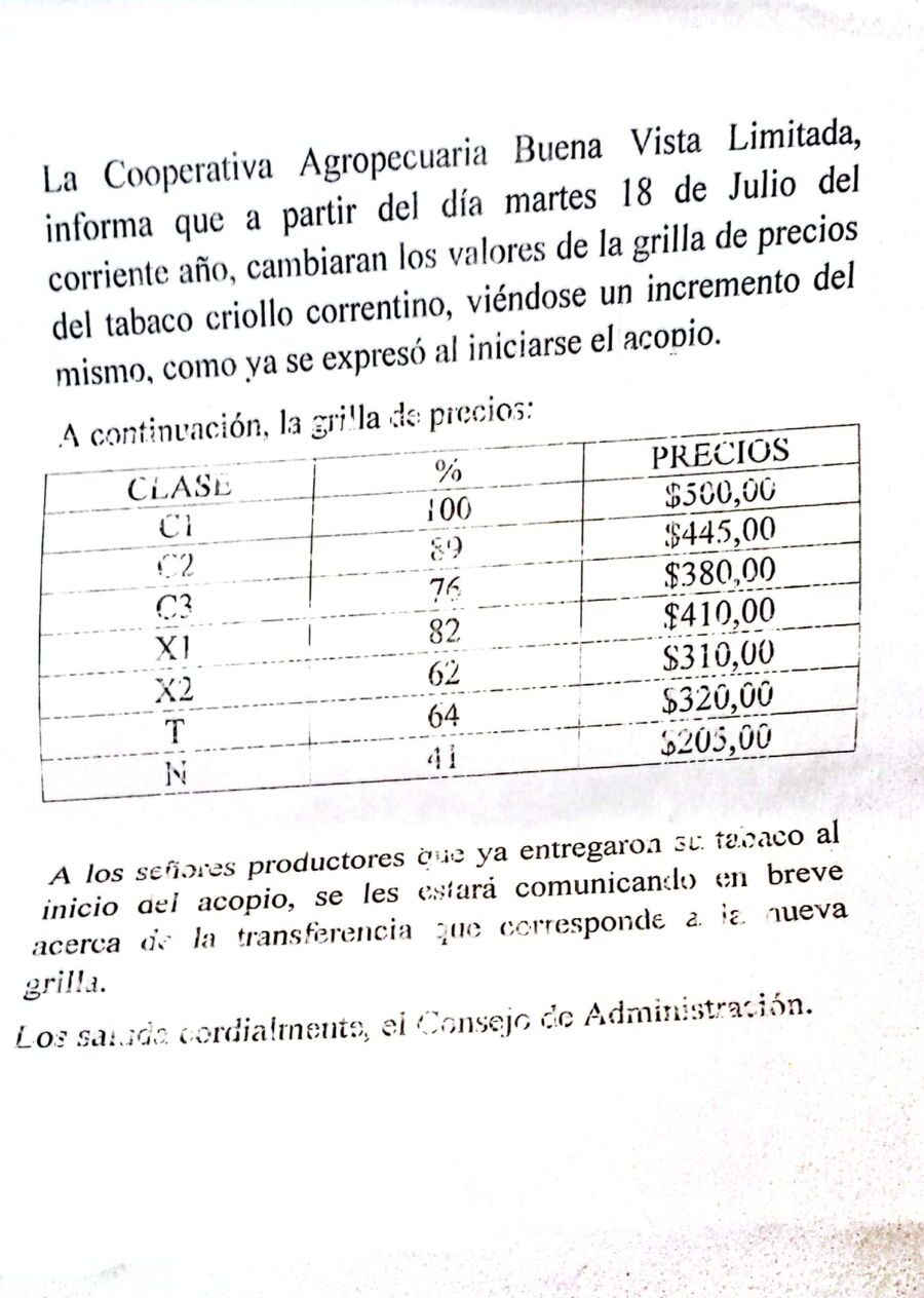 La Cooperativa Agropecuaria Buena Vista Limitada, informa que a partir del día martes 18 de Julio del corrientes año, cambiaran los valores de la grilla de precios del tabaco criollo correntino, viéndose un incremento del mismo, como ya se expresó al iniciarse el acopio.