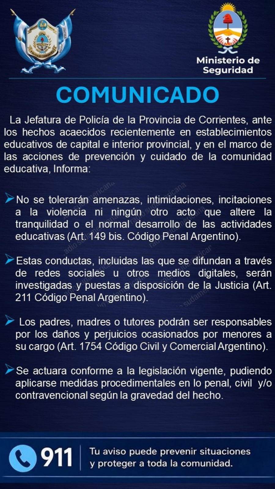 En la misma tónica, adelantaron que “estas conductas, incluidas las que se difundan a través de redes sociales u otros medios digitales, serán investigadas y puestas a disposición de la Justicia”. (Art. 211 Código Penal Argentino). La Policía comunicó que “los padres, madres o tutores podrán ser responsables por los daños y perjuicios ocasionados por menores a su cargo” (Art. 1754 Código Civil y Comercial Argentino).