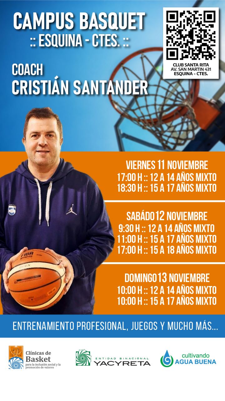 La Entidad Binacional Yacyretá esta vez desarrollará capacitaciones gratuitas destinadas a directores técnicos, profesores y jugadores de básquet de toda la provincia. La misma se realizará en la ciudad de Esquina y serán coordinadas por el ex Director Técnico de la selección Argentina de Básquet Femenino, Cristian Santander.