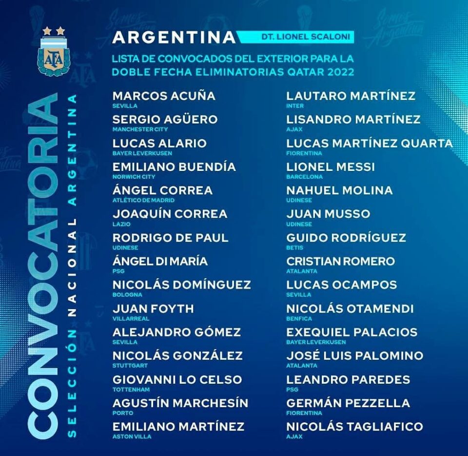 La lista de citados del exterior -en las próximas semanas se sumarán los futbolistas del medio local- la encabeza el capitán Lionel Messi, quien estará acompañado de su gran amigo Sergio Kun Agüero, el regreso más resonante. Su último partido con la Selección fue el 18 de noviembre de 2019, en el empate 2 a 2 ante Uruguay en Tel Aviv.