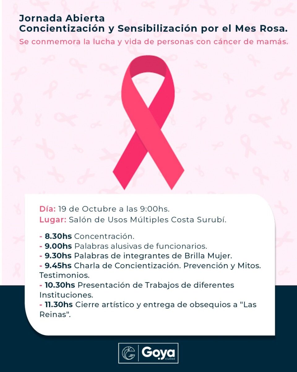 Se invita a una Jornada Abierta para conmemorar la lucha y vida de cáncer de mama, el próximo 19 de octubre en el Salón de Usos Múltiples de Costa Surubí, desde las 9 horas.