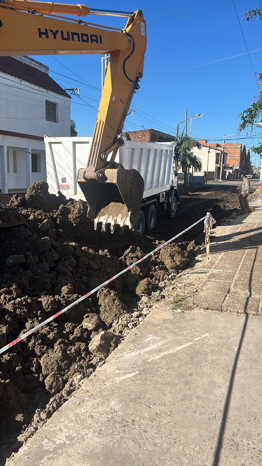 La municipalidad avanza con los trabajos que viene realizando en calle 25 de Mayo; en la continuidad de esta trascendental y fundamental obra se viene accionando en el saneamiento del suelo de esa arteria de la ciudad.