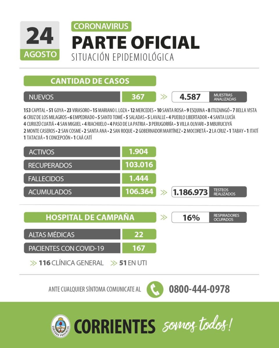 El Ministerio de Salud Pública de Corrientes informó a través de su reporte epidemiológico diario que se registraron 367 nuevos contagios de coronavirus en las últimas 24 horas. Además, fallecieron ocho personas por la enfermedad en la provincia.