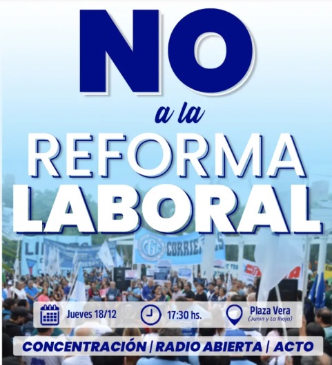 Bajo la consigna «NO a la Reforma Laboral de Milei» las principales centrales gremiales, los sindicatos, las organizaciones sociales y trabajadores organizados de Corrientes se movilizarán este jueves 18 de diciembre desde las 17:30 horas por las calles de la Capital.