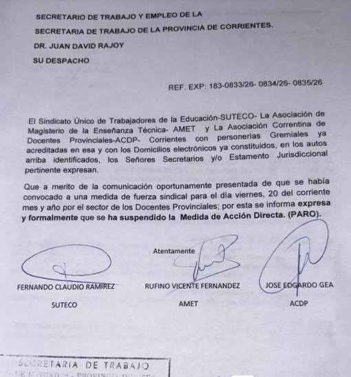 El Sindicato Único de Trabajadores de la Educación-SUTECO- La Asociación de Magisterio de la Enseñanza Técnica- AMET y La Asociación Correntina de Docentes Provinciales-ACDP- Corrientes habían convocado a un paro laboral para esté 20 de Marzo.