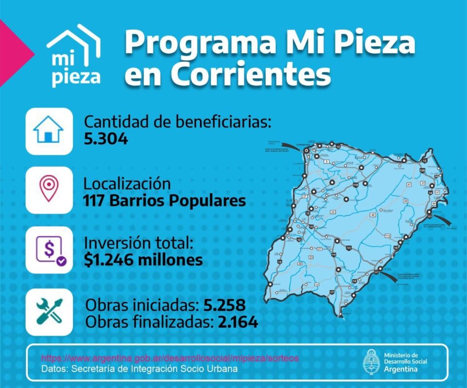 El Gobierno Nacional dio a conocer datos actualizados sobre la instrumentación del Programa Mi Pieza en la provincia de Corrientes. Destinado a mujeres, mayores de 18 años, residentes en Barrios Populares, argentinas o con residencia permanente; a nivel provincial hay 5.304 beneficiarias sobre un total de 5.964 inscriptas (1.837 se inscribieron el pasado 23 de mayo). La Inversión total sobre el universo de beneficiarias en la provincia de Corrientes es de $1.246 millones.