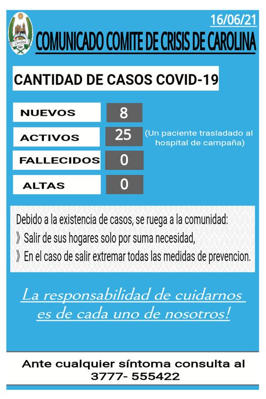 En los últimos días se registro un importante crecimiento de casos en Carolina. En las ultimas 24 horas se han registrado 8 nuevos contagios de coronavirus, el total de activos es de 25.
