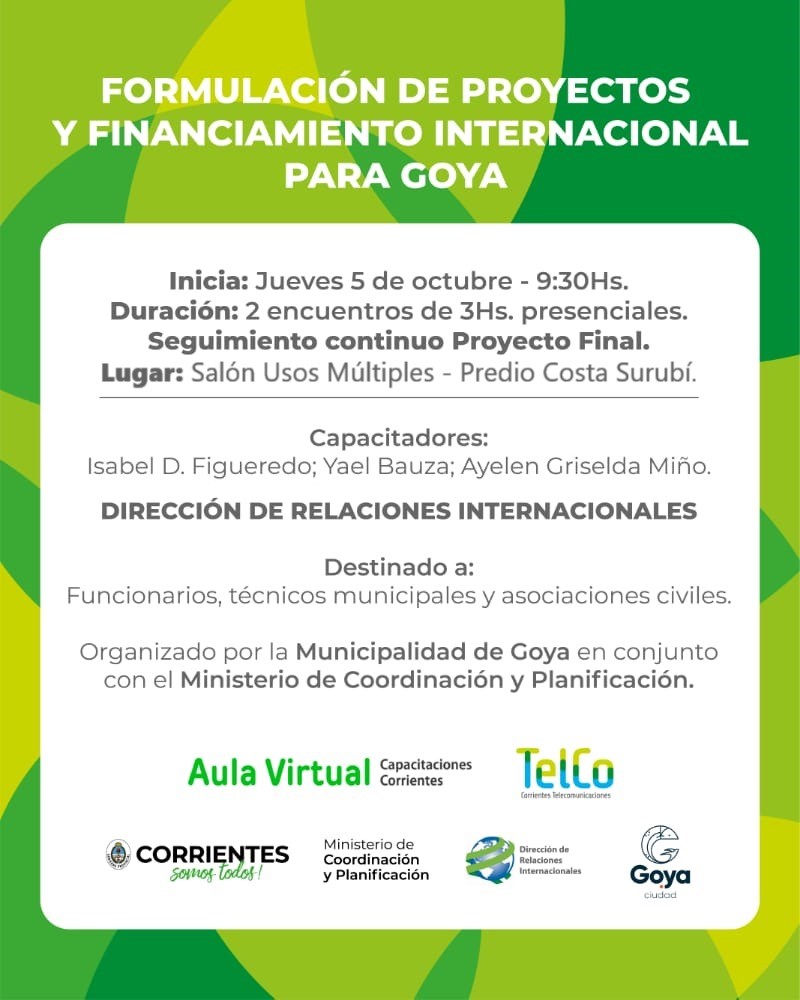 Organizado por la Secretaría de Planificación Económica y Productiva a cargo de la doctora Andrea Aquino, con la Dirección de Relaciones Internacionales, este jueves tendrá lugar en Salón de Usos Múltiples de Costa Surubí a partir de las 9:30 horas una capacitación llamada Formulación de Proyectos y Financiamiento Internacional.