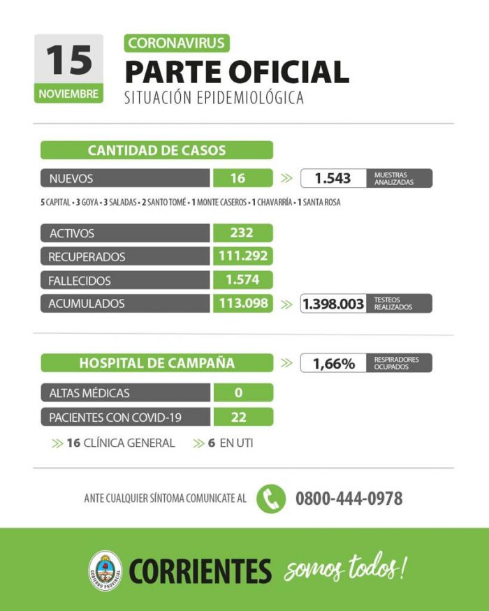 El parte epidemiológico de este lunes 15 de noviembre detalla que Corrientes registró 16 casos de coronavirus y no se produjeron fallecimientos en el Hospital de Campaña. La cifra de fallecidos es de 1.574 víctimas desde el inicio de la pandemia y 113.098 contagios.