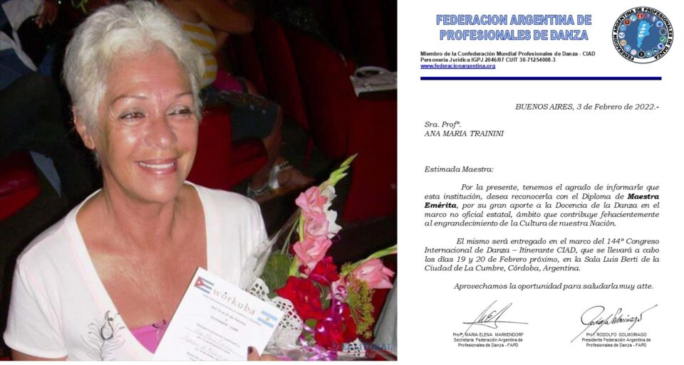 La Federación Argentina de Profesionales de la Danza, FAPD, distinguió a la profesora Ana María Trainini, fundadora de Ballet Municipal y referente indiscutida en Goya y la región, como MAESTRA EMÉRITA, por su gran aporte a la Cultura Nacional. Esta distinción se entregó en el 144° Congreso Internacional de la Danza que tuvo lugar en La Cumbre, provincia de Córdoba, el 20 de febrero de 2022.