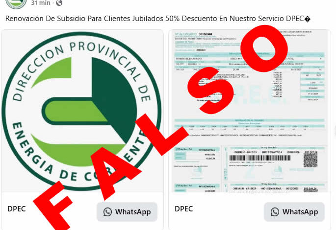 La Dirección Provincial de Energía de Corrientes (Dpec) advierte a la comunidad sobre la circulación de cuentas falsas en redes sociales: Facebook, Instagram, X y WhatsApp para ofrecer descuentos irreales de hasta un 50% en las facturas de energía, información absoluta y completamente falsa.