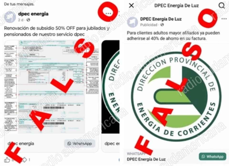 La Dirección Provincial de Energía de Corrientes (DPEC) advierte a la comunidad sobre la circulación de cuentas falsas en redes sociales: Facebook, Instagram, X y WhatsApp para ofrecer descuentos irreales de hasta un 50% en las facturas de energía, información completamente FALSA.
