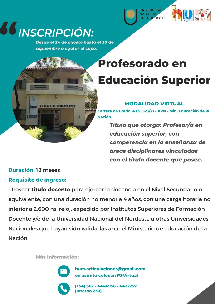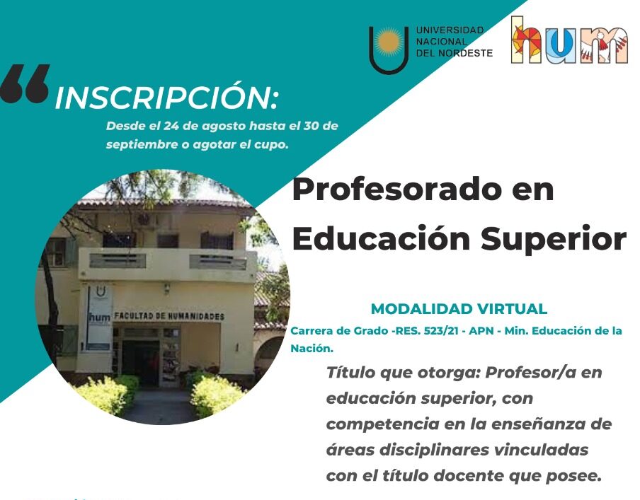 La Universidad Nacional del Nordeste informó que desde el 24 de agosto hasta el 30 de septiembre inicia la inscripción para cursar el Profesorado en Educación Superior, con duración de 18 meses.