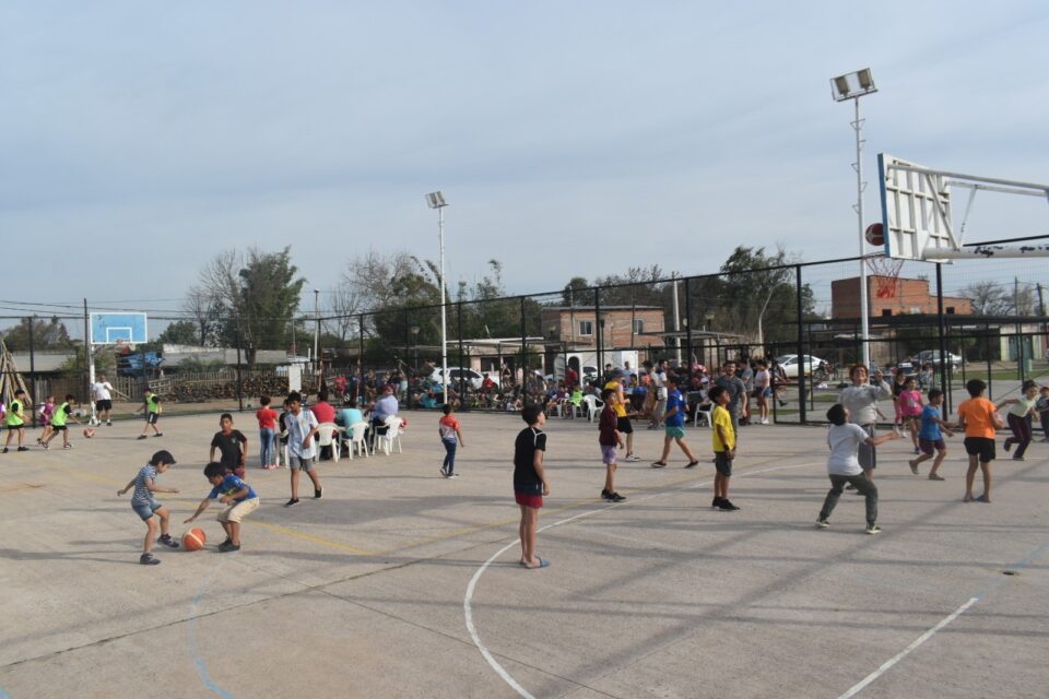 Los chicos del barrio Sarmiento y de los alrededores participaron del torneo en uno de los aros de la cancha. Mientras que profesores de la Dirección de Deportes enseñaban a otros chicos los elementos de la práctica del básquetbol.