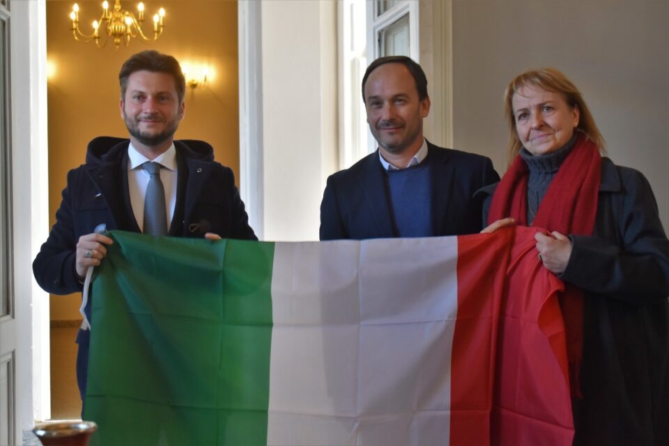 A la Sociedad Italiana entregó una bandera del país peninsular, que fue recibida por la presidente de la Sociedad Italiana Laura Filippa Farmar quien visiblemente emocionada no pudo contener las lágrimas por tamaño obsequio.