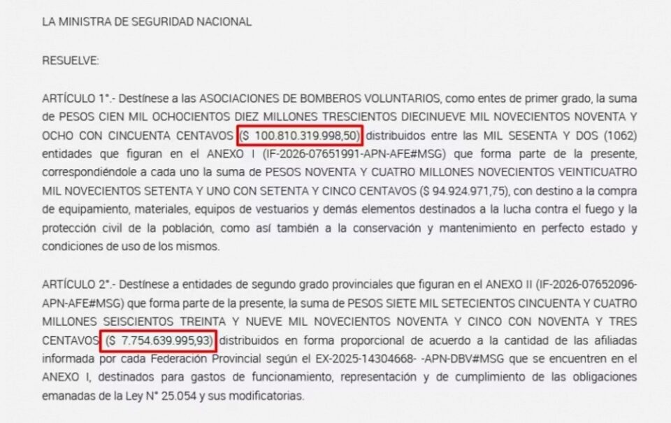 Antes de que se determine qué decisión política se tomará, este jueves a la madrugada se publicó en el Boletín Oficial la Resolución 91/2026 del Ministerio de Seguridad Nacional, dirigida por Alejandra Monteoliva, la cual establece una serie de medidas para el fortalecimiento del financiamiento del sistema de Bomberos Voluntarios en todo el país.