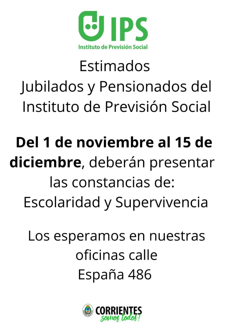 La Delegación del Instituto de Previsión Social (IPS) en Goya comunica a los beneficiarios que deberán presentar la documentación correspondiente a escolaridad y supervivencia del 1 de Noviembre al 15 de Diciembre. El organismo subraya la importancia de cumplir con el plazo establecido para evitar la suspensión de los beneficios.
