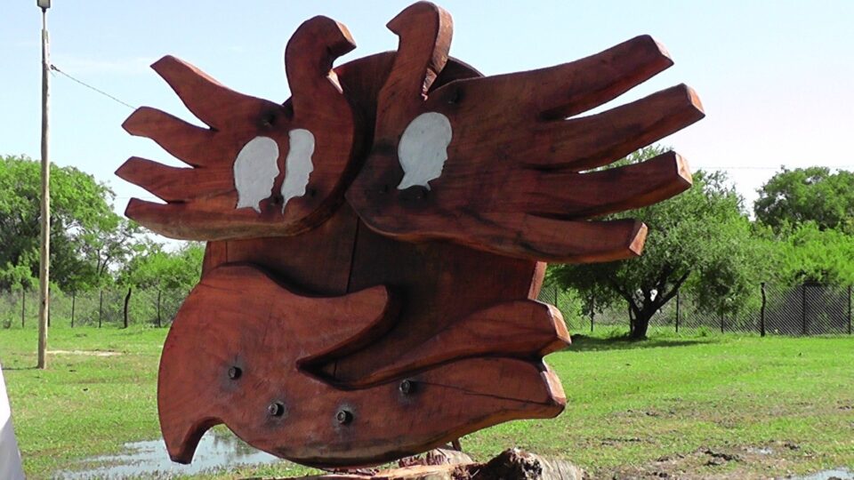 Es así, que luego del solemne acto en plaza de la Memoria, continuó el programa en la llamada Casa de las Palmeras, frente al Campo Hípico, con la inauguración de una creación en madera realizada por el artista Nazareno Velázquez.Consta de una representación en madera, en plano con diferentes tablones, relieve, es una obra abstracta, un mapa del mundo con dos manos entrelazadas que se transforman en palomas.