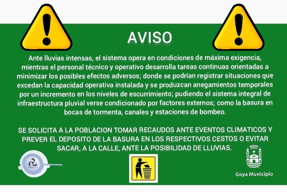 Desde el Municipio se insta a la población a tomar recaudos frente a eventos climáticos, evitando sacar la basura a la vía pública y depositándola en los cestos correspondientes. Durante lluvias intensas, el sistema pluvial trabaja en condiciones de máxima exigencia y puede verse afectado por factores externos, como la obstrucción de bocas de tormenta, canales y estaciones de bombeo, lo que podría generar anegamientos temporales.
