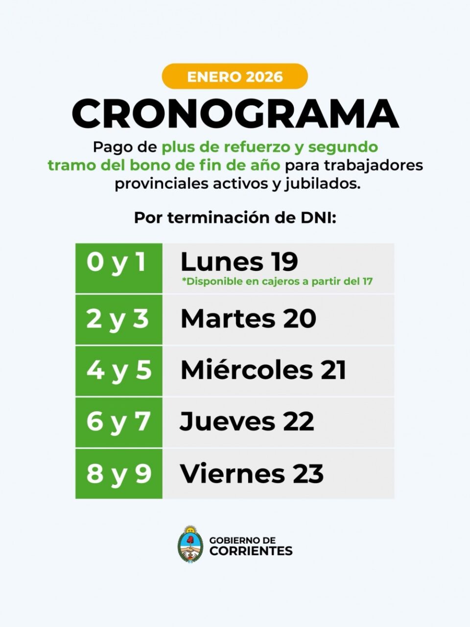 El Plus de Refuerzo de este mes y, en simultáneo, el segundo tramo del Bono Navideño se paga a partir de este lunes 19, jornada que percibirán los agentes de la administración pública provincial, activos, jubilados y pensionados, con Documento Nacional de Identidad terminados en 0 y 1.