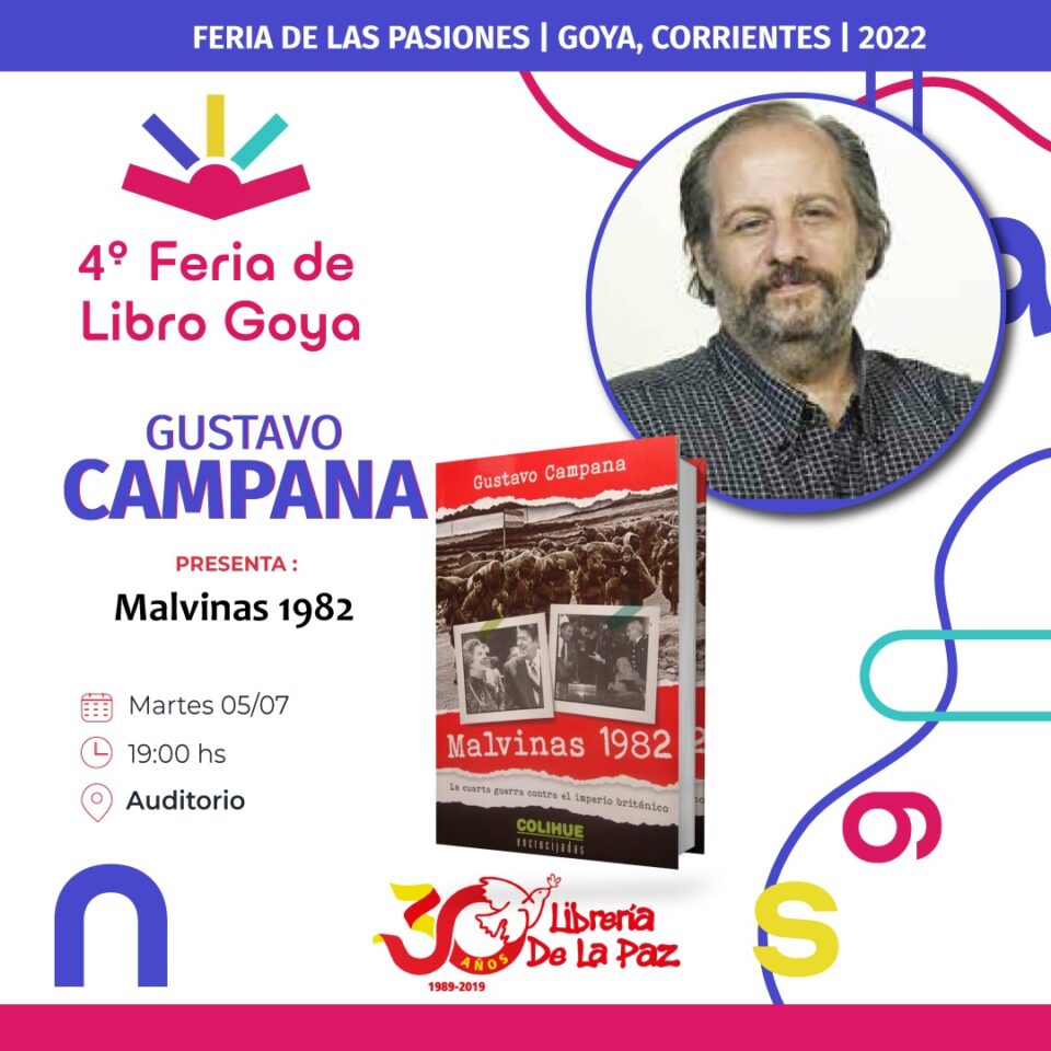 Hoy martes 5 de julio, Gustavo Campana presentará su libro “Malvinas 1982 – La cuarta guerra contra el imperio británico”, en el marco de la 4° Feria del Libro Goya “Feria de las Pasiones”, a la hora 19,00 en el Auditoria del Tinglado del Predio de Costa Surubí.