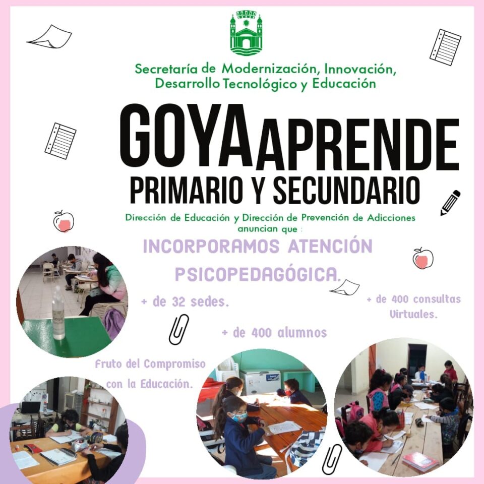 La Dirección de Educación, dirigida por la Lic. Laura Segovia, junto a la Dirección de Prevención de Adicciones que conduce la Lic. Vanesa Morales, anuncian la incorporación de atención psicopedagógica para las más de 32 sedes del programa Goya Aprende.
