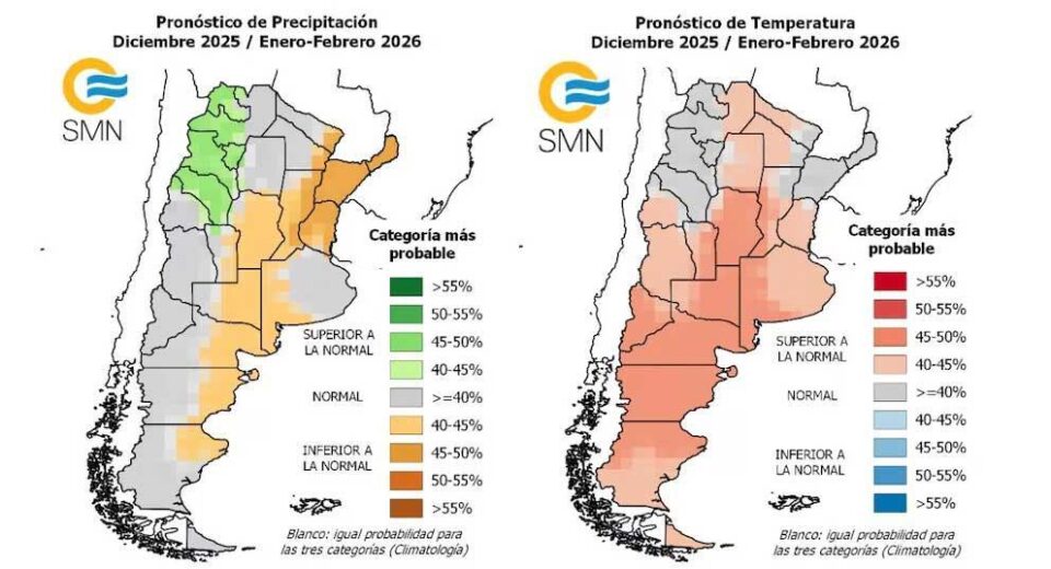 Y provincias como Mendoza, San Juan, Entre Ríos, Santiago del Estero, Chaco, Formosa, Ciudad de Buenos Aires y Tierra del Fuego tendrán una probabilidad de un 40% a 45% de incremento de temperatura.