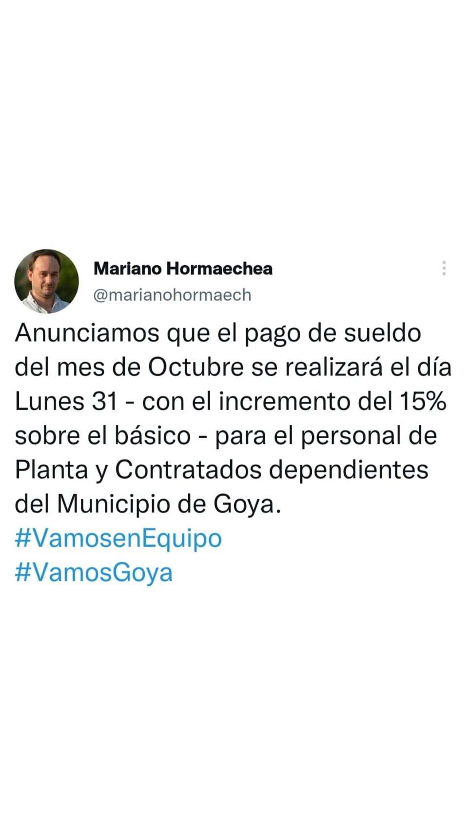Mariano Hormaechea informó en sus redes sociales: “anunciamos que el pago de sueldo del mes de octubre se realizará el lunes 31 con el incremento del 15% sobre el básico, para el personal de Planta Permanente y Contratados, dependientes del municipio”.