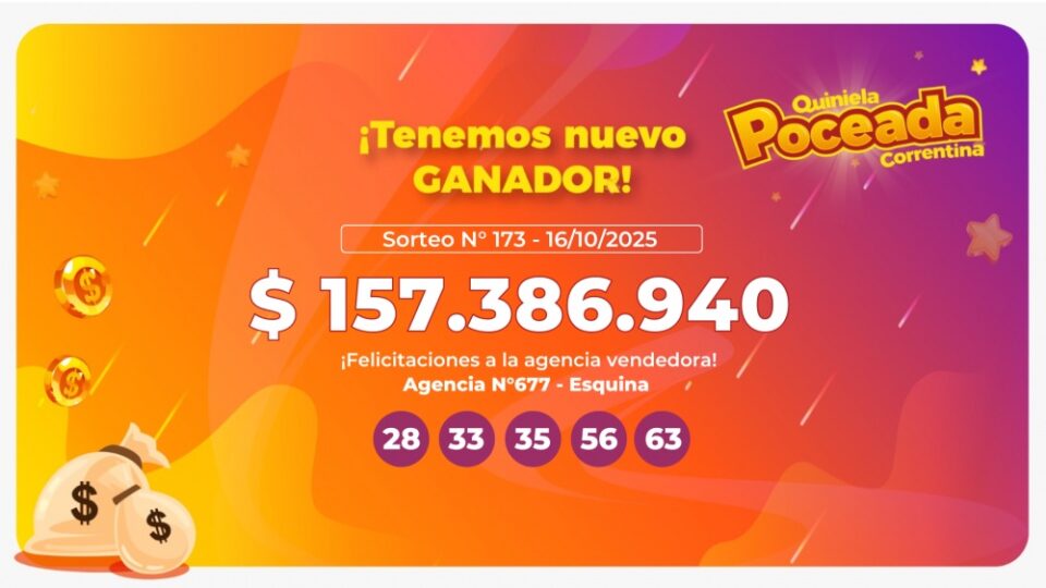 La Quiniela Poceada Correntina sigue sumando ganadores en toda la provincia. En el sorteo más reciente, un apostador de la localidad de Esquina acertó los cinco números y se llevó un pozo millonario de $157.386.940.