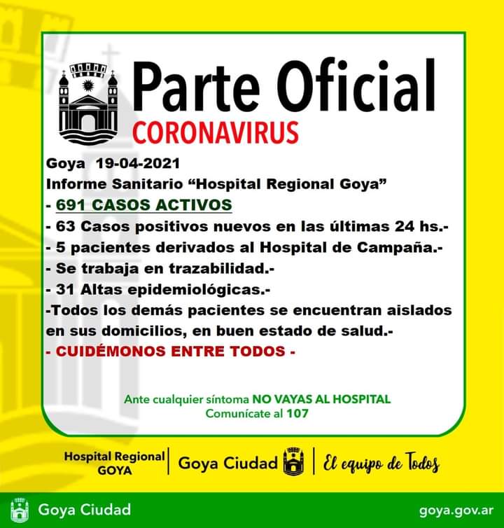 El Parte Oficial indica que el total de casos activos en nuestra ciudad es de 691. Ademas informa que 5 pacientes fueron derivados al Hospital de Campaña.